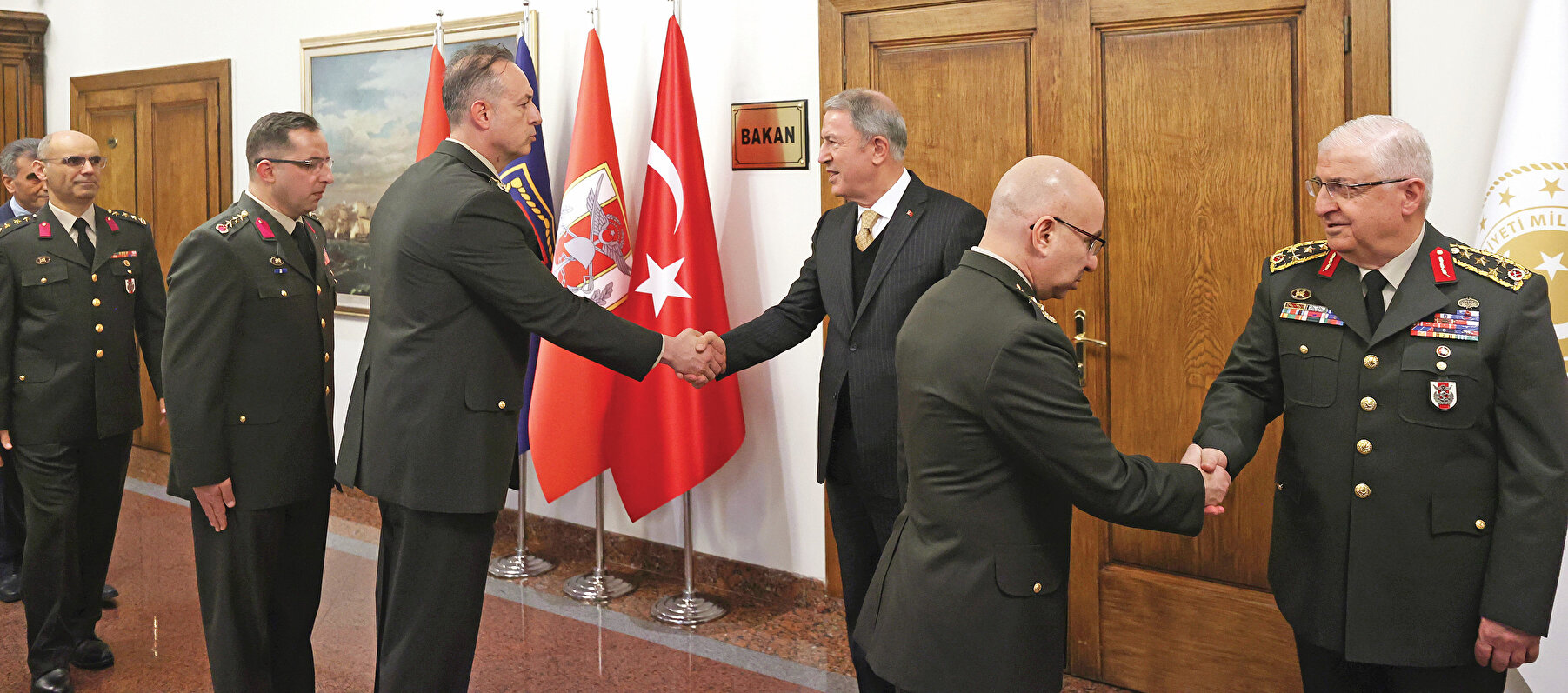 Milli Savunma Bakanı Hulusi Akar, Genelkurmay Başkanı Orgeneral Yaşar Güler ile birlikte, personelin yeni yılını kutladı. Bakan yardımcılarından subay, astsubay, sivil memur, uzman erbaş ve erlere kadar karargahtaki tüm personelin yeni yılını tek tek kutlayan Akar, daha sonra gündeme ilişkin açıklamalarda bulundu.
