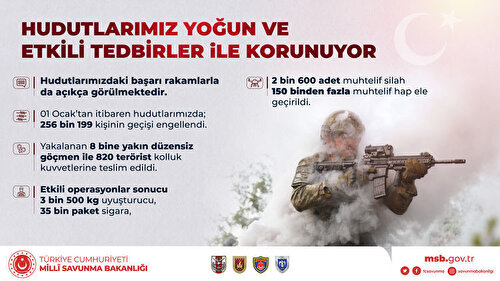 Hudutlarda sınır fiziki güvenlik sistemine dayalı tel örgü, hendek, duvar ve gözetleme sistemlerinden meydana gelen dünya standartlarında, yüksek teknolojiye sahip araç, gereç ve teçhizat kullanıldığını, her geçen gün alınan ilave tedbirlerle sınır güvenliğinin güçlendirildiğini dile getiren Akar, "1 Ocak'tan itibaren hudutlarımızda 256 bin 199 kişinin geçişi engellenmiş, yakalanan 8 bine yakın düzensiz göçmen ile 820 terörist kolluk kuvvetlerine teslim edilmiştir. Etkili operasyonlar sonucu 3 bin 500 kilogram uyuşturucu, 35 bin paket sigara, 2 bin 600 adet muhtelif silah ile 150 binden fazla muhtelif uyuşturucu hap ele geçirilmiştir. Hudutlarımızdaki başarı rakamlarla da açıkça görülmektedir." ifadelerini kullandı.