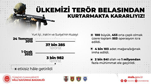 Terörle mücadelenin artan bir şiddet ve tempoda ve taarruzi bir ruhla, azim ve kararlılıkla, başarılı bir şekilde devam ettiğini ifade eden Akar, "Çözüm sürecinin bittiği tarihten bugüne kadar yurt içinde, Irak ve Suriye’nin kuzeyinde toplam 37 bin 285, bu yılın başından itibaren ise 3 bin 982 terörist etkisiz hale getirilmiştir." diye konuştu.
