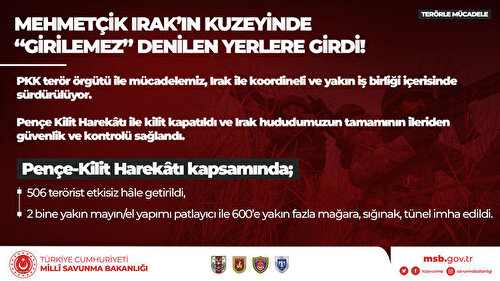 Milli Savunma Bakanı Hulusi Akar, "Pençe-Kilit Harekatı kapsamında 506 terörist etkisiz hale getirilmiş, 2 bine yakın mayın/el yapımı patlayıcı, 600’e yakın mağara, sığınak, tünel imha edilmiştir" dedi.