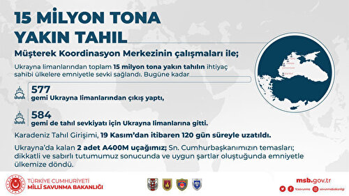 Cumhurbaşkanı Erdoğan'ın yürüttüğü aktif diplomasiyle sağlanan zeminde Rusya ve Ukrayna Savunma Bakanlıkları ile gerçekleştirdikleri görüşmeler sonucunda Karadeniz Tahıl Girişimi'nin imzalandığını hatırlatan Akar, "Girişim kapsamında İstanbul'da kurulan Müşterek Koordinasyon Merkezinin çalışmaları ile bugüne kadar Ukrayna limanlarından yaklaşık 15 milyon ton tahılın ihtiyaç sahibi ülkelere emniyetle sevki sağlanmış, bugüne kadar Ukrayna limanlarından 577 gemi çıkarken 584 gemi de Ukrayna limanlarına ulaşmıştır." dedi.
