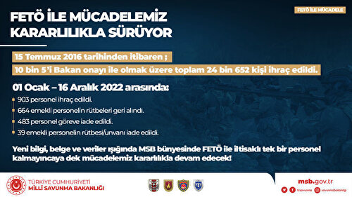 FETÖ ile mücadele kapsamında 15 Temmuz 2016 tarihinden itibaren 10 bin 5'i bakan onayıyla olmak üzere toplam 24 bin 652 kişinin ihraç edildiğini ifade eden Akar, yeni bilgi, belge ve veriler ışığında mücadelenin kararlılıkla devam ettiğini söyledi.