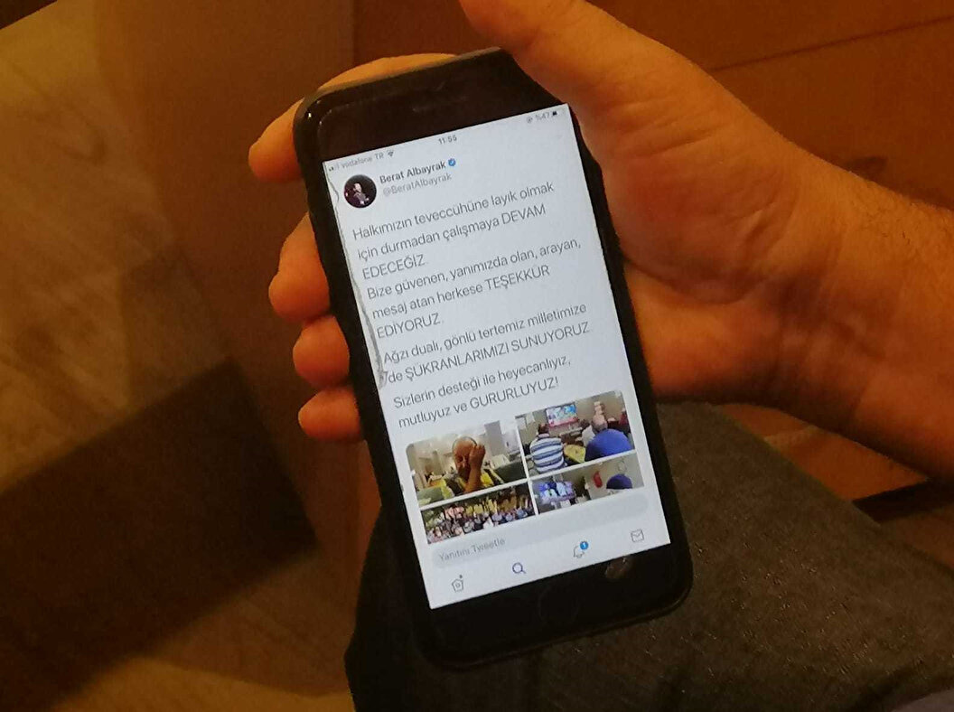 Hazine ve Maliye Bakanı Albayrak'ın, Cumhurbaşkanı Erdoğan'ın açıklaması sırasında çekilen fotoğrafını Twitter adresinden paylaştığını hatırlatarak, "Bakanımız Berat Albayrak'ın fotoğrafımı paylaşmasına mutlu oldum. Kendisine çok teşekkür ediyorum. Onların emekleri boşa gitmeyecek. Biz her zaman onları destekliyoruz ve onlara inanıyoruz." ifadesini kullandı.