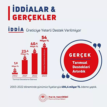 Bakan Kirişci, resmi sosyal medya hesabından yaptığı açıklamada, "1,8 milyar TL olan tarımsal destekleme bütçesini 29 kat artırarak 54 milyar TL'ye yükselttik.