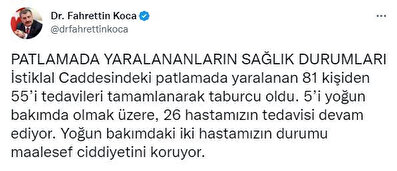 Bakan Koca, ''İstiklal Caddesi'ndeki patlamada yaralanan 81 kişiden 55’i tedavileri tamamlanarak taburcu oldu. 5’i yoğun bakımda olmak üzere, 26 hastamızın tedavisi devam ediyor. Yoğun bakımdaki iki hastamızın durumu maalesef ciddiyetini koruyor'' açıklamasında bulundu.