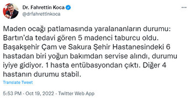 Bakan Koca paylaşımında şu ifadelere yer verdi: "Bartın’da tedavi gören beş madenci taburcu oldu. Başakşehir Çam ve Sakura Şehir Hastanesi’ndeki altı hastadan biri yoğun bakımdan servise alındı, durumu iyiye gidiyor. Bir hasta entübasyondan çıktı. Diğer dört hastanın durumu stabil.”