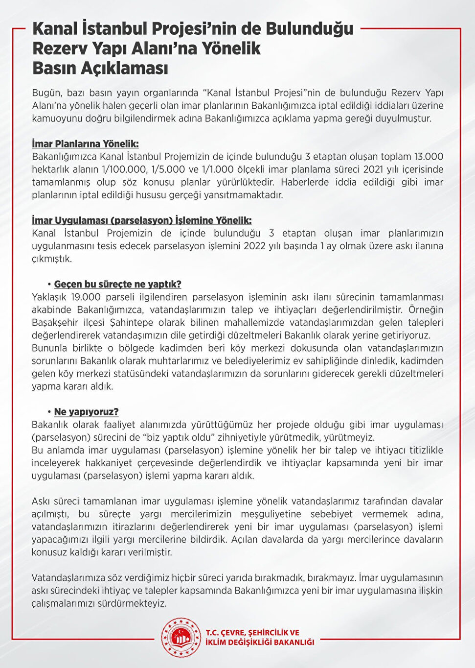 Çevre, şehircilik ve İklim Değişikliği Bakanlığı da sosyal medya hesabından basın açıklamasında bulundu. Bakanlık yaptığı açıklamada; ' Bugün bazı basın yayın orgalarında 'Kanal İstanbul Projesi' nde bulunduğu Reazerv Yapı Alanı'na yönelik hala geçerli olan imar planlarının Bakanlığımızca iptal edildiği iddiaları üzerine kamuoyunu bilgilendirmek adına Bakanlığmızca açıklama yapma gereği duyurulmuştur' ifadelerine yer verildi.