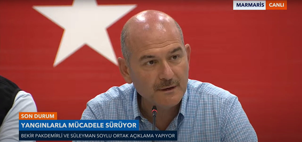 Tarım ve Orman Bakanı Pakdemirli ile İçişleri Bakanı Soylu, Marmaris Öğretmenevi’nde basın mensuplarına açıklamalarda bulundu. Pakdemirli yangınlardaki son durumu paylaşarak, "Muğla'da 5 yangın devam ediyor. 38 ilde 163 yangın çıktı. 152 tanesi söndürüldü" ifadelerini kullandı. Soylu ise yangınlarla ilgili provokasyon yapıldığını kaydederek, "Burada hiç kimse siyasi ve ideolojik bir ayrım ortaya koymadan mücadelesini sürdürüyor. Provokasyon var mı, var. Bunların hepsine göğüs gereceğiz." şeklinde konuştu.
