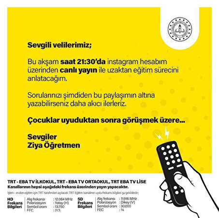 Twitter'dan paylaşımda bulunan Selçuk, "Sevgili velilerimiz; Bu akşam Instagram hesabım üzerinden canlı yayın ile uzaktan eğitim sürecini anlatacağım. Sorularınızı şimdiden bu paylaşımın altına yazabilirseniz daha akıcı ilerleriz. Çocuklar uyuduktan sonra görüşmek üzere" ifadelerini kullandı.