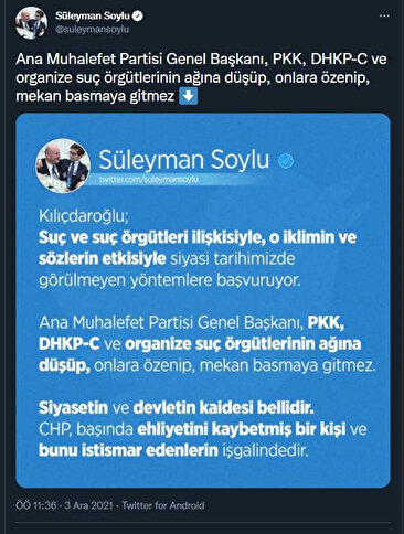 Soylu, paylaşımında "Kılıçdaroğlu; suç ve suç örgütleri ilişkisiyle, o iklimin ve sözlerin etkisiyle siyasi tarihimizde görülmeyen yöntemlere başvuruyor.