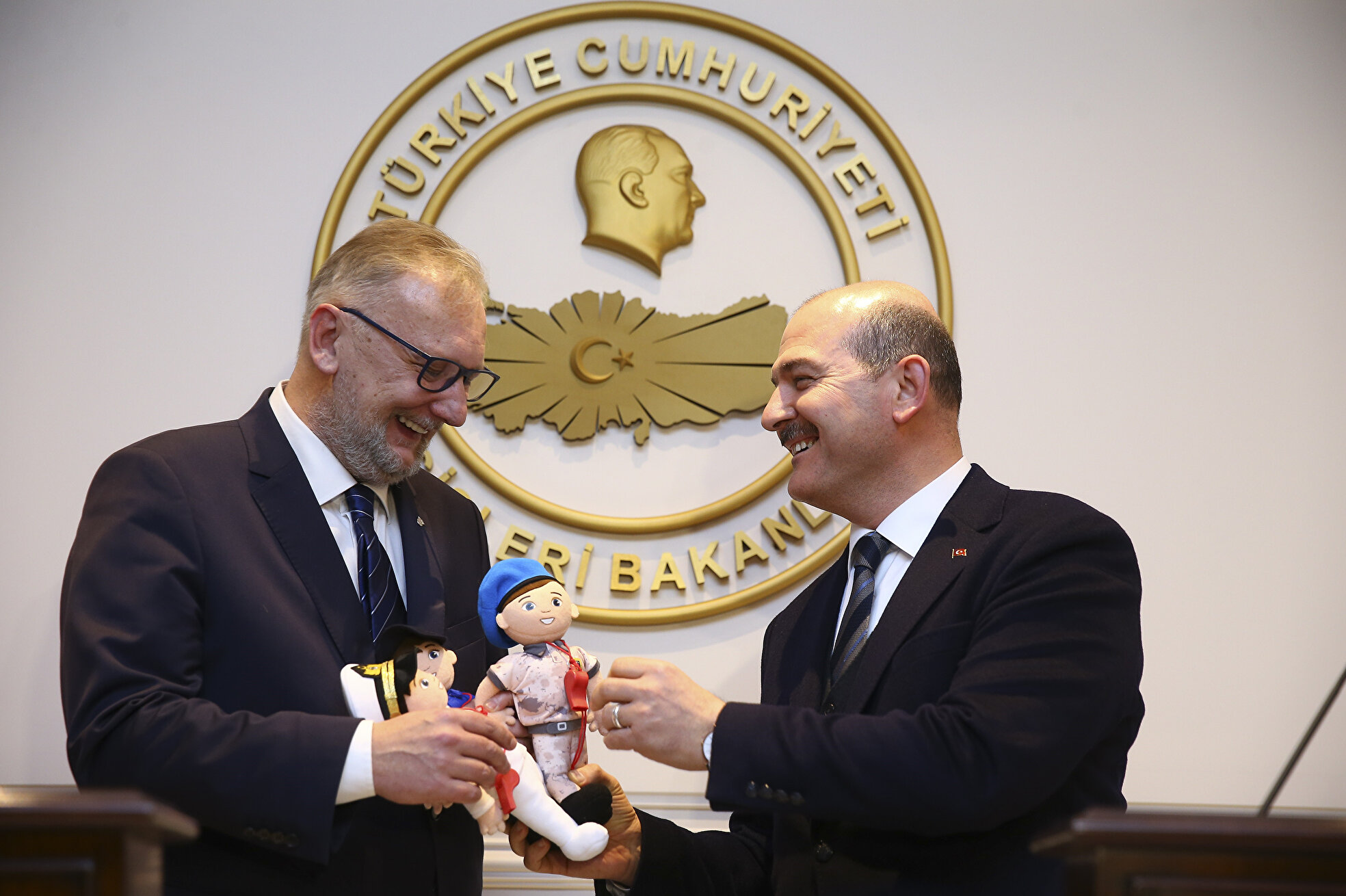 Konuşmanın ardından Soylu, Hırvat mevkidaşının doğacak torununa oyuncak hediye etti.