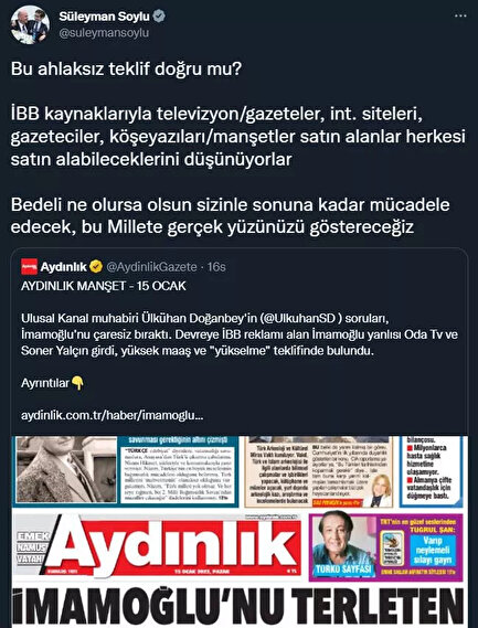 İçişleri Bakanı Süleyman Soylu Aydınlık gazetesinin "İmamoğlu'nu terleten Ulusal Kanal muhabirini satın almak istediler" başlıklı manşetini paylaşarak "Bu ahlaksız teklif doğru mu?" sorusunu yöneltti.