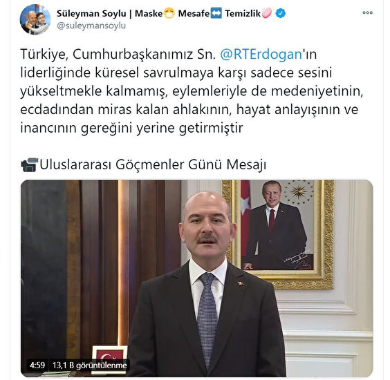 İçişleri Bakanı Süleyman Soylu, 18 Aralık Uluslararası Göçmenler Günü nedeniyle Twitter'da paylaştığı mesajda şu ifadelere yer verdi: "Türkiye, İdlib'den Afrin'e, Azez'den Mare'ye, Cerablus'tan Resulayn'a kadar 8 bin 161 kilometrekare alanda zulmü durdurmuş, 1 milyon 750 bin insanın hayatını normalleştirmiş, terör örgütlerinden arındırmış, ikamet izni ile kalanlar hariç barındırdığı toplam 4 milyon yabancıyı, muhtemel bir zulüm ve ölümden kurtarmıştır"
