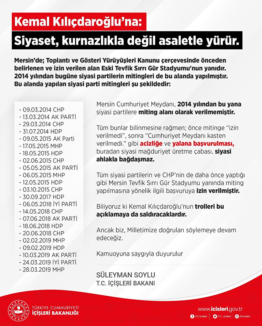 İçişleri Bakanı Süleyman Soylu, Mersin'de yer alan Cumhuriyet Meydanı'nda miting yapma taleplerinin reddedildiğini açıklayan CHP Genel Başkanı Kemal Kılıçdaroğlu'na sosyal medya hesabından yaptığı paylaşımla tepki gösterdi. Meydanın 2014 yılından bu yana siyasi partilere miting alanı olarak verilmediğini vurgulayan Bakan Soylu, "Acizliğe ve yalana başvurulması ve siyasi mağduriyet üretme çabası, siyasi ahlakla bağdaşmaz" dedi.