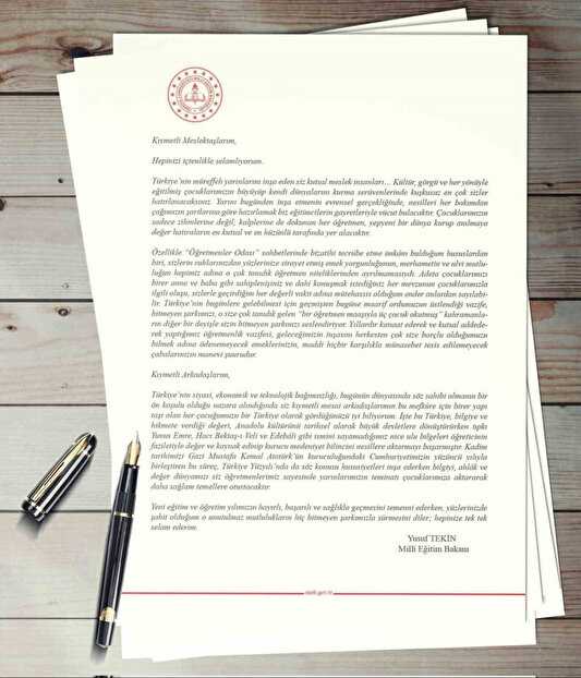 Milli Eğitim Bakanı Yusuf Tekin yeni eğitim öğretim yılı dolayısıyla öğretmenlere hitaben bir mektup kaleme aldı. Tekin mektubunda, öğretmenliğin Türkiye’nin müreffeh yarınlarını inşa eden bir meslek olduğunu belirterek, "Yarını bugünden inşa etmenin evrensel gerçekliğinde, nesilleri her bakımdan çağımızın şartlarına göre hazırlamak biz eğitimcilerin gayretleriyle vücut bulacaktır. Çocuklarımızın sadece zihinlerine değil, kalplerine de dokunan her öğretmen, yepyeni bir dünya kurup anılmaya değer hatıraların en kutsal ve en hüzünlü tarafında yer alacaktır" dedi.