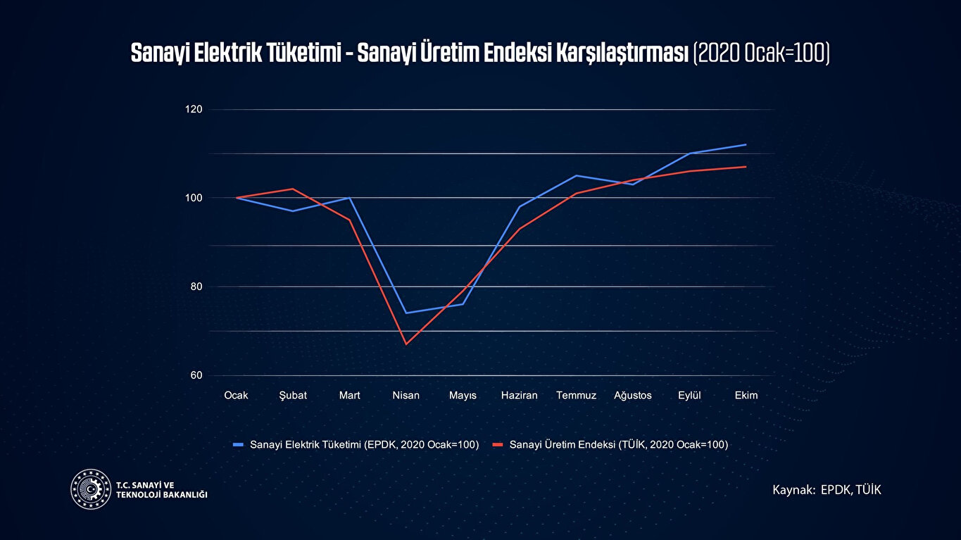 Sanayi ve Teknoloji Bakanı Mustafa Varank, "Sanayide üretim arttıysa elektrik tüketimi neden düştü?" haberine rakamlarla cevap verdi. "Pandemiye rağmen Türkiye’nin sanayi üretimi artıyor. Bu iftiracılara cevabı biz değil rakamlar versin" sözleriyle grafikler paylaşarak cevap verdi. Verilere göre, elektrik üretiminde ağustosta yüzde 14, eylülde yüzde 7,8, ekimde yüzde 9, kasımda yüzde 8,4 ve aralıkta yüzde 9,8 artış yaşandı.