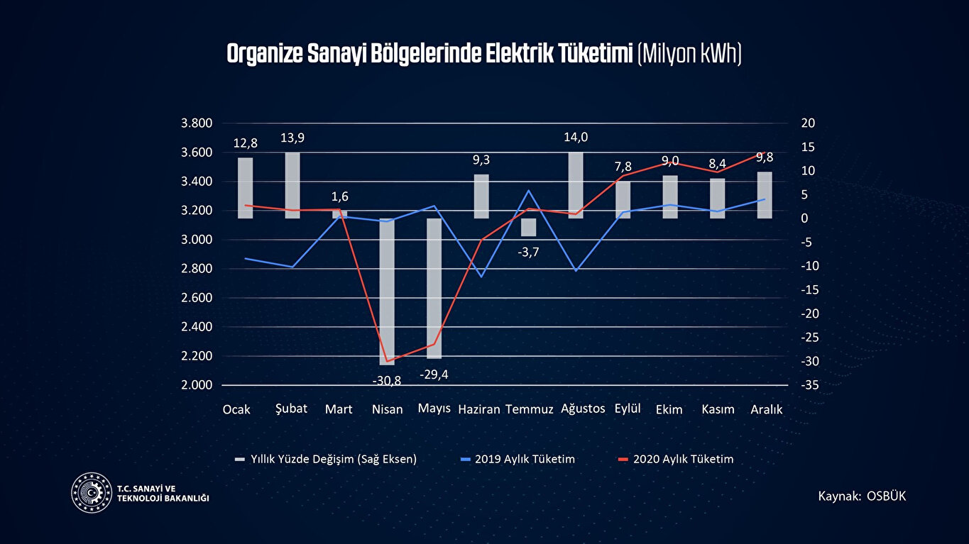 Bakan Varank’ın Twitter’dan yaptığı paylaşımda yer verdiği grafiklere göre, Organize Sanayi Bölgelerinde (OSB) elektrik tüketiminde 2020 yılında Covid-19 salgınının da etkisiyle nisanda yüzde 30,8, mayısta yüzde 29,4, temmuz ayında yüzde 3,7 düşüş gözlenirken, haziranda 9,3, ağustosta yüzde 14, eylülde yüzde 7,8, ekimde yüzde 9, kasımda yüzde 8,4 ve aralıkta yüzde 9,8 yıllık bazda artış yaşandı.
