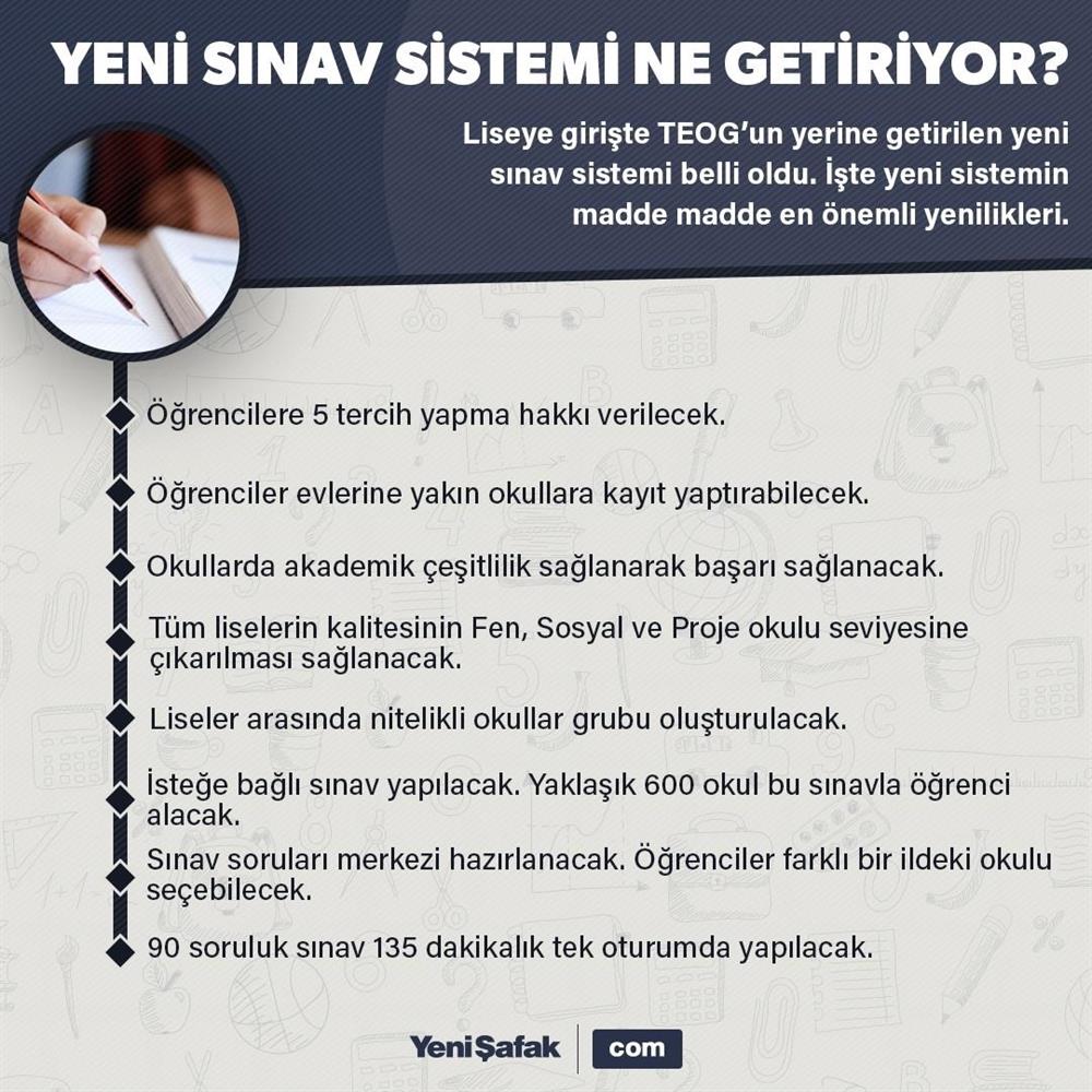 Milli Eğitim Bakanı İsmet Yılmaz, TEOG'un yerine gelen yeni sistemin detaylarına ilişkin açıklamada bulundu. Yılmaz, "Sadece 8. sınıftan soru sorulacak. Tek oturumda 135 dakikada sınav yapılacak ve 90 soru sorulacak" dedi.