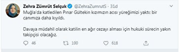 - Selçuk, Twitter'da yaptığı paylaşımda, Pınar Gültekin'in katledilmesinin yürekleri yaktığını belirterek, "Bir canımıza daha kıyıldı. Davaya müdahil olarak katilin en ağır cezayı alması için hukuki sürecin yakın takipçisi olacağız" ifadelerini kullandı.