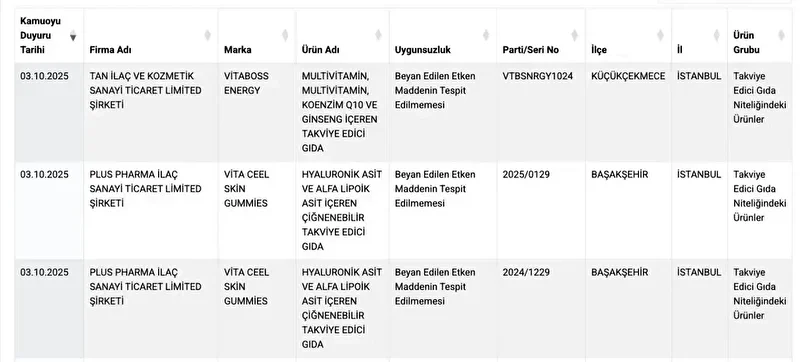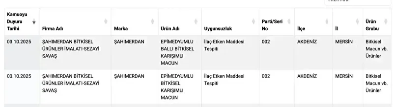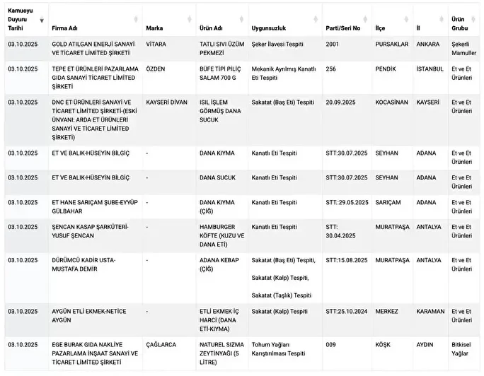 Tarım ve Orman Bakanlığı, sağlığı tehlikeye atan ürünler listesine yeni firmalar ve ürünler ekledi. Denetimlerde macunda ilaç etken maddesi, üzüm pekmezinde şeker, piliç salamda mekanik ayrılmış et, sucukta baş ve sakatat tespit edildi.
