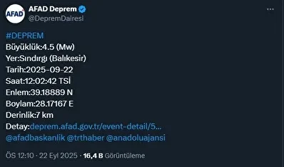 Afet ve Acil Durum Yönetimi Başkanlığı'nın (AFAD) internet sitesinde yer alan bilgiye göre, merkez üssü Sındırgı ilçesi olan 4,5 büyüklüğünde sarsıntı kaydedildi.