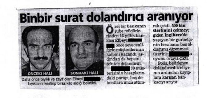 İstanbul'daki büyük vurgun 19 yıl sonra aydınlatıldı. Bir banka şubesinde müdür olarak çalışırken müşterilerine boş dekont imzalattırarak zimmetine 4,5 milyon dolar ve 500 bin sterlin geçirdiği suçlamasıyla 19 yıldır aranan Elbeyi A. (61), polis tarafından yakalandı. Şüphelinin firarda olduğu dönemde, sosyal medya üzerinde tanıştığı kadınların yanında kaldığı, kılık değiştirip sahte kimlik kullandığı tespit edildi. Şüpheli çıkarıldığı mahkeme tarafından tutuklandı.