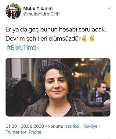 - İçişleri Bakanı Süleyman Soylu, ana muhalefetin 30 Ağustos kutlamalarıyla ilgili açıklamalarına tepki gösterdi. CHP Avcılar Gençlik Kolları Başkan Yardımcısı Mutlu Yıldırım'ın, DHKP-C terör örgütü üyeliği suçundan tutuklanan ve örgüt talimatıyla başlattığı ölüm orucunda can veren Ebru Timtik'le ilgili “Er ya da geç bunun hesabı sorulacak. Devrim şehitleri ölümsüzdür” paylaşımını hatırlatan Bakan Soylu, “Bize 30 Ağustos dersi verenler; 30 Ağustos bizim şerefimizdir. Gazi Mustafa Kemal ve kahraman arkadaşları, kahraman ecdadımız İstiklal mücadelesini, DHKP-C’li terörist hainlerin 'şehit' diye anılması için vermediler. 30 Ağustos’u bize değil, CHP Gençlik Kolları’na anlatın. Yazık!” dedi.
