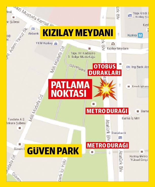 Tren garı ve Merasim Sokak katliamlarının ardından Ankara dün 3. kez alçak bir terör saldırısı ile sarsıldı. Tren Garı ve Merasim Sokak katliamların ardından dün akşam da Kızılay Güvenpark'taki polis noktasına bomba yüklü araçla intihar saldırısı düzenlendi. Patlamada 35 kişi hayatını kaybetti, 19'u ağır 122 kişi de kişi yaralandı.