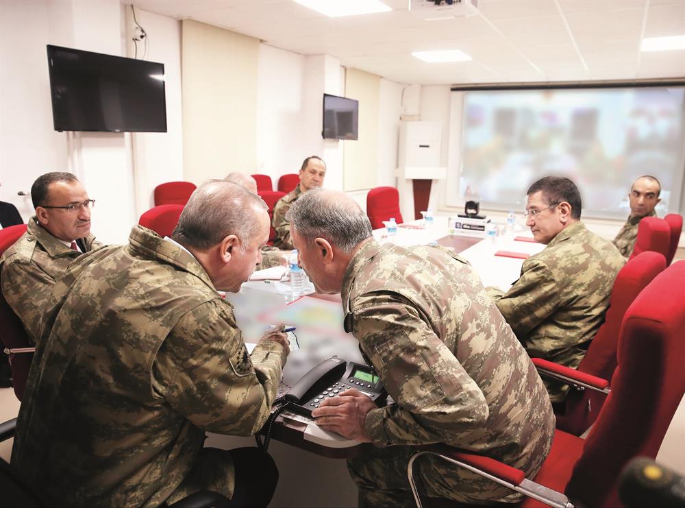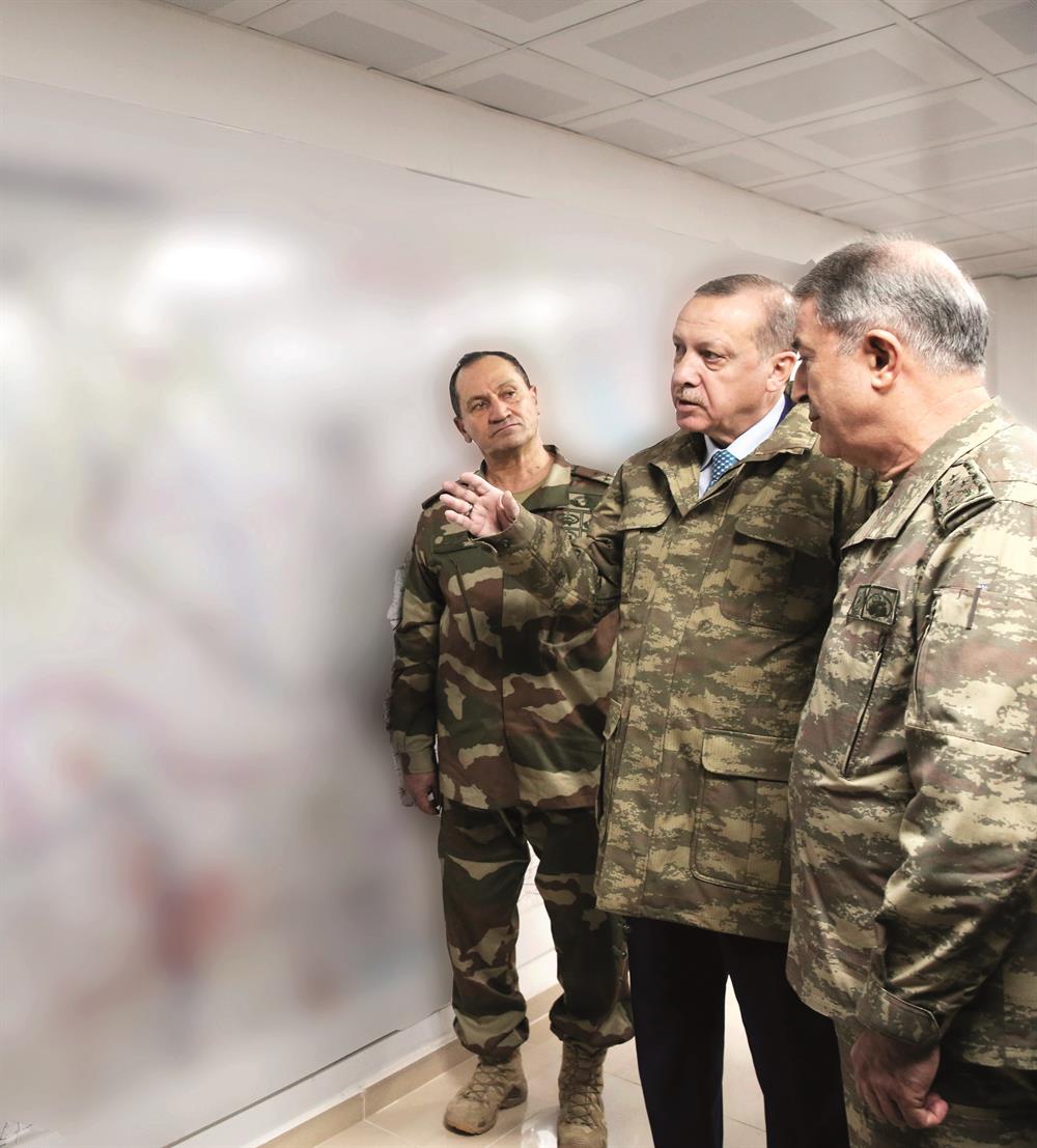 Cumhurbaşkanı Erdoğan, Genelkurmay Başkanı Orgeneral Hulusi Akar’la dün akşam saatlerinde Ankara’dan Zeytin Dalı Harekatı’nın sevk ve idaresinden sorumlu olan 2. Ordu’nun Hatay’daki Harekat Merkezi’ne gitti. Erdoğan’a, Başbakan Yardımcısı Bekir Bozdağ, Savunma Bakanı Nurettin Canikli, Kara Kuvvetleri Komutanı Org. Yaşar Güler de eşlik etti. Erdoğan, beraberindeki heyetle birlikte Harekat Merkezi’nde 2. Ordu Komutanı Korgeneral İsmail Metin Temel'den harekat hakkında bilgi aldı. Erdoğan, harekatla ilgili daha detaylı bilgiler aldığı toplantı esnasında, video konferans aracılığıyla Genelkurmay Başkanlığı, Kara, Hava ve Deniz Kuvvetleri komutanlıklarının yanı sıra Eskişehir Muharebe Üs Komutanlığı’ndaki harekat merkezleriyle bağlantılar gerçekleştirdi.