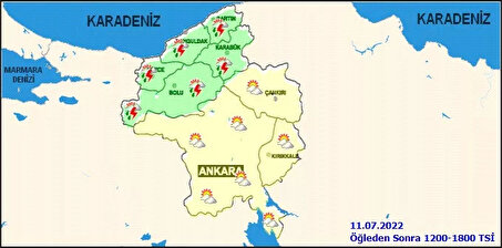 Ankara: Hava sıcaklıklarında önemli bir değişiklik beklenmemektedir. Sıcaklıklar 28 ile 15 derece arasında olacak. Bölge genelinin parçalı yer yer çok bulutlu, bu akşam saatlerinde Çankırı ve Ankara'nın güney çevreleri yerel olmak üzere sağanak ve gök gürültülü sağanak yağışlı, yarın akşam saatlerine kadar Bartın, Düzce, Zonguldak, Bolu, ve Karabük çevrelerinin aralıklı sağanak ve gök gürültülü sağanak yağışlı geçeceği tahmin edilmekte.
