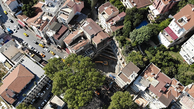 Öte yandan, ikinci dereceden tarihi binanın bitişiğindeki inşaat havadan görüntülendi. Havadan çekilen görüntülerde, inşaat alanı bitişiğindeki başka bir binanın da duvarlarında çatlaklar oluştuğu görüldü. İş makinelerinin molozları topladığı anlar da görüntülere yansıdı.