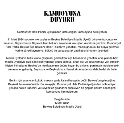 "Ancak ne yazık ki, Cumhuriyet Halk Partisi Beykoz İlçe Başkanı Mahir Tastan ve yönetimi, meclis grubunu bir araya getirmek yerine sürekli ayrıştırıcı, bölücü ve parçalayarak zayıflatıcı bir tutum izlemiştir. Meclis üyelerinin birlik içinde çalışması gerekirken, ilçe başkanı ve yönetimi arka planda bazı meclis üyeleriyle gizli işbirlikleri yaparak grubu bölmüş, ortak aklı ve dayanışmayı yok etmiştir. Kişisel ihtiraslarını Beykoz'un menfaatlerinin önüne koyan bu anlayış, partimizin mecliste etkin olmasını engellemiş, Beykoz'a ve Beykozlulara hizmet etme irademizi dahi hedef alır hale gelmiştir. Benim için esas olan koltuk, makam ya da kişisel hesaplar değil, Beykoz'un geleceği ve Beykozluların menfaatidir. Bu anlayışla Cumhuriyet Halk Partisi üyeliğimden istifa ediyor, yoluma halkın iradesini ve Beykoz'un çıkarlarını önceleyen bir çizgide devam edeceğimi kamuoyuna ilan ediyorum"