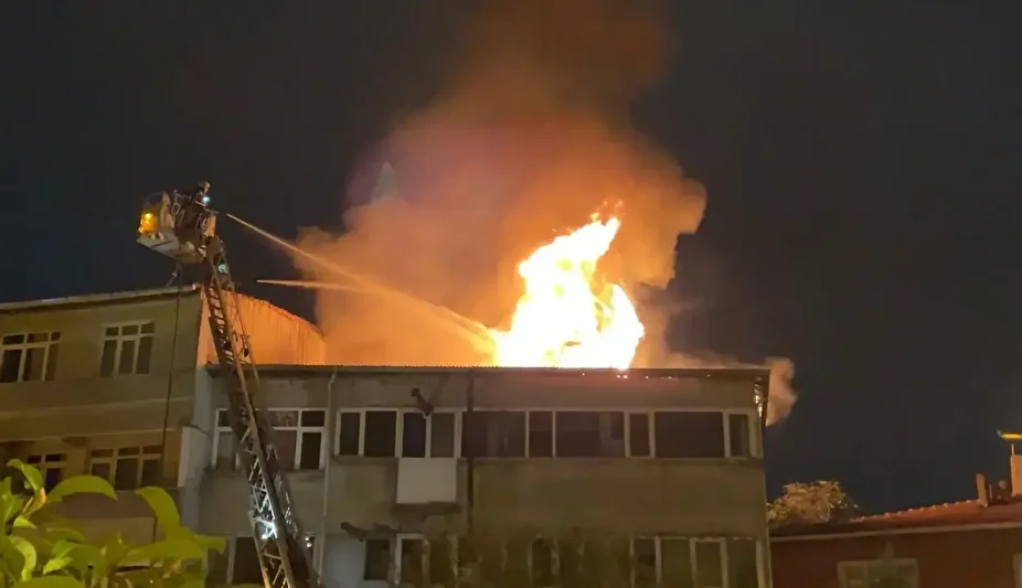 Rüzgarın etkisiyle kısa sürede büyüyen yangında alevler çatının tamamını sardı.