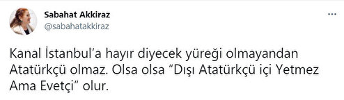 “Kanal İstanbul’a hayır diyecek yüreği olmayandan Atatürkçü olmaz. Olsa olsa ‘Dışı Atatürkçü içi Yetmez Ama Evetçi’ olur”