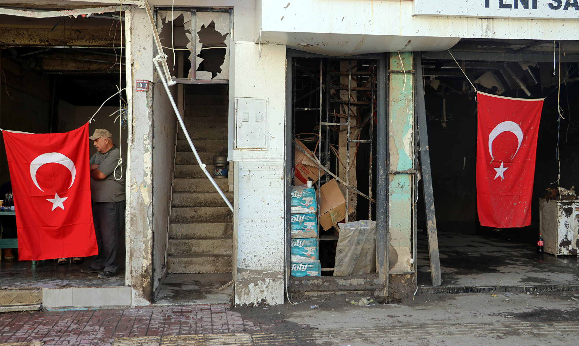 - Devlet millet el ele yaralarını sarmaya çalışan esnaf, temizlik çalışması sırasında bulunan Türk bayraklarını yıkayarak dükkanlarının önüne asıyor.