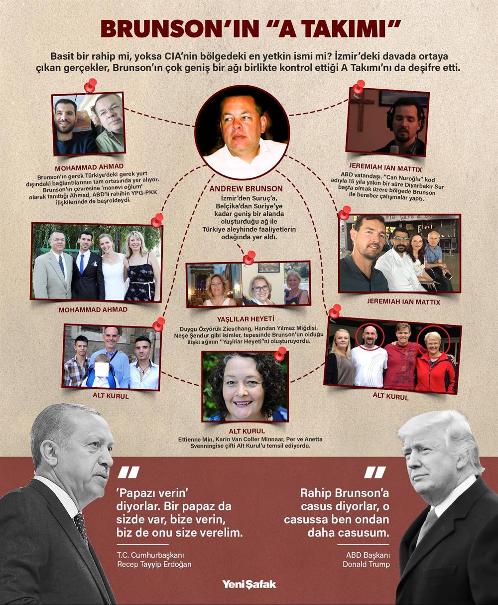 Geçtiğimiz gün İzmir’de görülen ve kamuoyunda ‘Rahip Brunson’ davası olarak bilinen davada ilginç bağlantılar çıkmaya devam ediyor. Mahkemede ifade veren gizli tanıklar ‘Serhat’ ve ‘Ateş’ Brunson’ın ‘dini faaliyetler’ kılıfı altında gerek İzmir ve çevresinde gerek Türkiye’nin güneydoğu sınırındaki ilginç bağlantılarıyla ilgili önemli açıklamalarda bulundular. İfadeler, Brunson’ın sadece kendisinin değil, ‘A Takımı’ olarak nitelenebilecek yakın çevresinin de Türkiye aleyhinde örgütsel faaliyetlerde bulunduğunu gözler önüne serdi.
