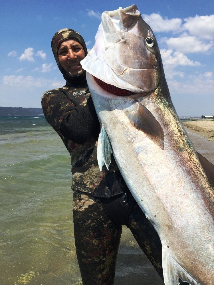 Yaklaşık 30 yıldır serbest dalış zıpkınla balık avcılığı yaptığını ifade eden Müjdat Turan, “Bugünde(dün) normalde sabah suyu yapmam gerekirdi biraz geç kaldım. Saat 12.00 sularında suya girdim. Yaklaşık 8-9 knot esen fırtınada dalmaya karar verdim. Benim her zaman avladığım akya merasına gittim. Tabi bu sert havadan dolayı çok şiddetli akıntılar vardı. Merada yaklaşık 30 metre derinlik ve orta suda avladım balığı. İlk baş bunlar iki tane geldiler, önce meradaki yem popülasyonunu görünce burada bir avcı olduğunu hissettim ve örümcek tekniği dediğimiz bir teknikle balığı avlamayı başardım. Balığa zıpkın attıktan sonra boğazın orta sularına gemi yoluna yakın mesafelere balık beni sürükledi. Çünkü çok ciddi güçlü bir balık. 68 kilo civarında. Tabi bu kadar büyük balığı ben ilk defa vuruyorum. Bu balık Türkiye rekoru. Daha önce 60-65 kilo vuran arkadaşlarımız var Türkiye’de. Bu kadar güçlü bir balıkla yaklaşık 2 saat mücadele ettim. 2 saat sonunda balığı kıyıya çekmeyi başardım” dedi.