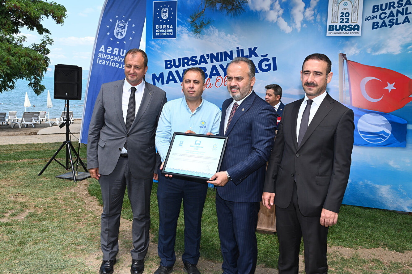 Bu yıl yaz sezonunda 24 adet halk plajında, 25 idari personel, 135 temizlik personeli ve 30 araçlık filo ile her gün rutin olarak 30 hektarlık sert zemin ve 76 hektarlık kumluk alanın temizliğini yapan Büyükşehir Belediyesi, hizmet kalitesini ‘Mavi Bayrak’la tescillemiş oldu. İznik Gölü’ne Mavi Bayrak alabilmek için Türkiye Çevre Eğitim Vakfı’na başvuran Büyükşehir Belediyesi, su kalitesinden temizlik ve can güvenliğine, engelli erişim imkanlarından soyunma kabinleri ve duşlara kadar 33 farklı kriteri yerine getirdi. İznik İnciraltı Halk Plajı, Bursa’nın ilk Mavi Bayraklı plajı olmaya hak kazandı. Mavi Bayrak, Büyükşehir Belediye Başkanı Alinur Aktaş, İznik Kaymakamı Recai Karal, İznik Belediye Başkanı Kağan Mehmet Usta ve Türkiye Çevre Eğitim Vakfı Kuzey Ege İller Koordinatörü Doğan Karataş’ın da katıldığı törenle İznik semalarında dalgalanmaya başladı.