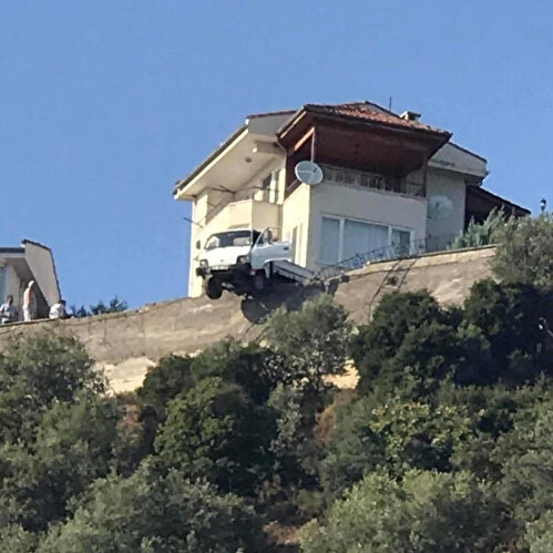 - Büyük bir kısmı boşlukta kalan kamyonetin sürücüsü çevredekiler tarafından kurtarıldı. Uçurumda askıda kalan kamyoneti gören vatandaşlar şaşkınlıklarını gizleyemezken, olası bir facianın önüne geçilmiş oldu.