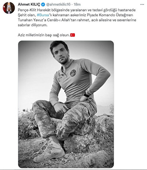 AK Parti Bursa Milletvekili Ahmet Kılıç, acı haberi Twitter hesabından paylaşarak, "Pençe-Kilit Harekat bölgesinde yaralanan ve tedavi gördüğü hastanede şehit olan, Bursalı kahraman askerimiz Piyade Komando Üsteğmen Tunahan Yavuz'a Cenab-ı Allah'tan rahmet, acılı ailesine ve sevenlerine sabırlar diliyorum. Aziz milletimizin başı sağolsun" dedi.
