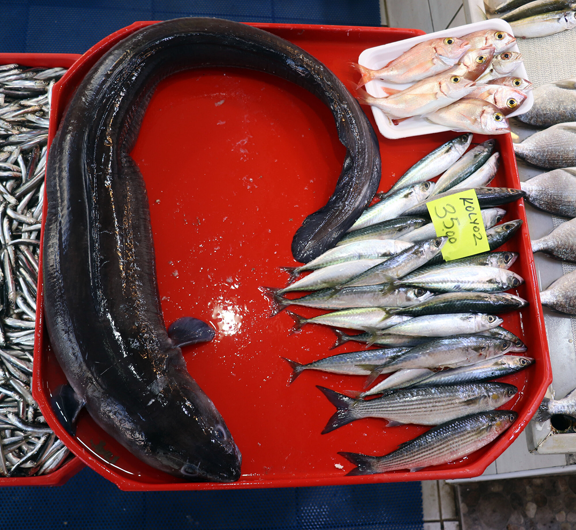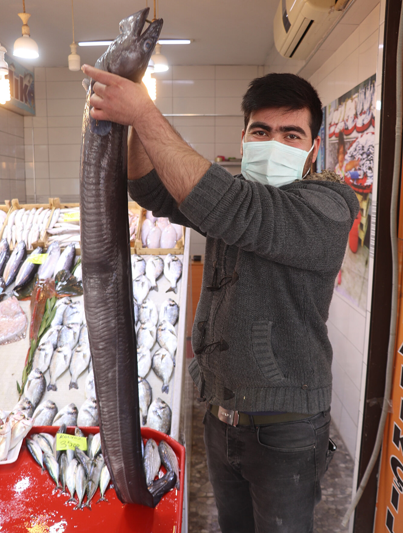 Genellikle deniz dibinde kayaların arasında gezdiği bilinen 1,5 metre boyunda ve 10 kilogram ağırlığındaki halk arasında yılan balığı olarak da bilinen mıgri, kilosu 20 liradan satışa çıkarıldı.