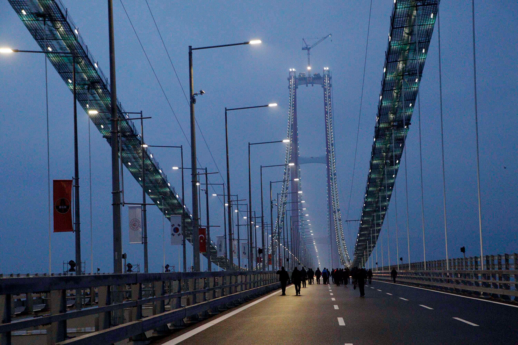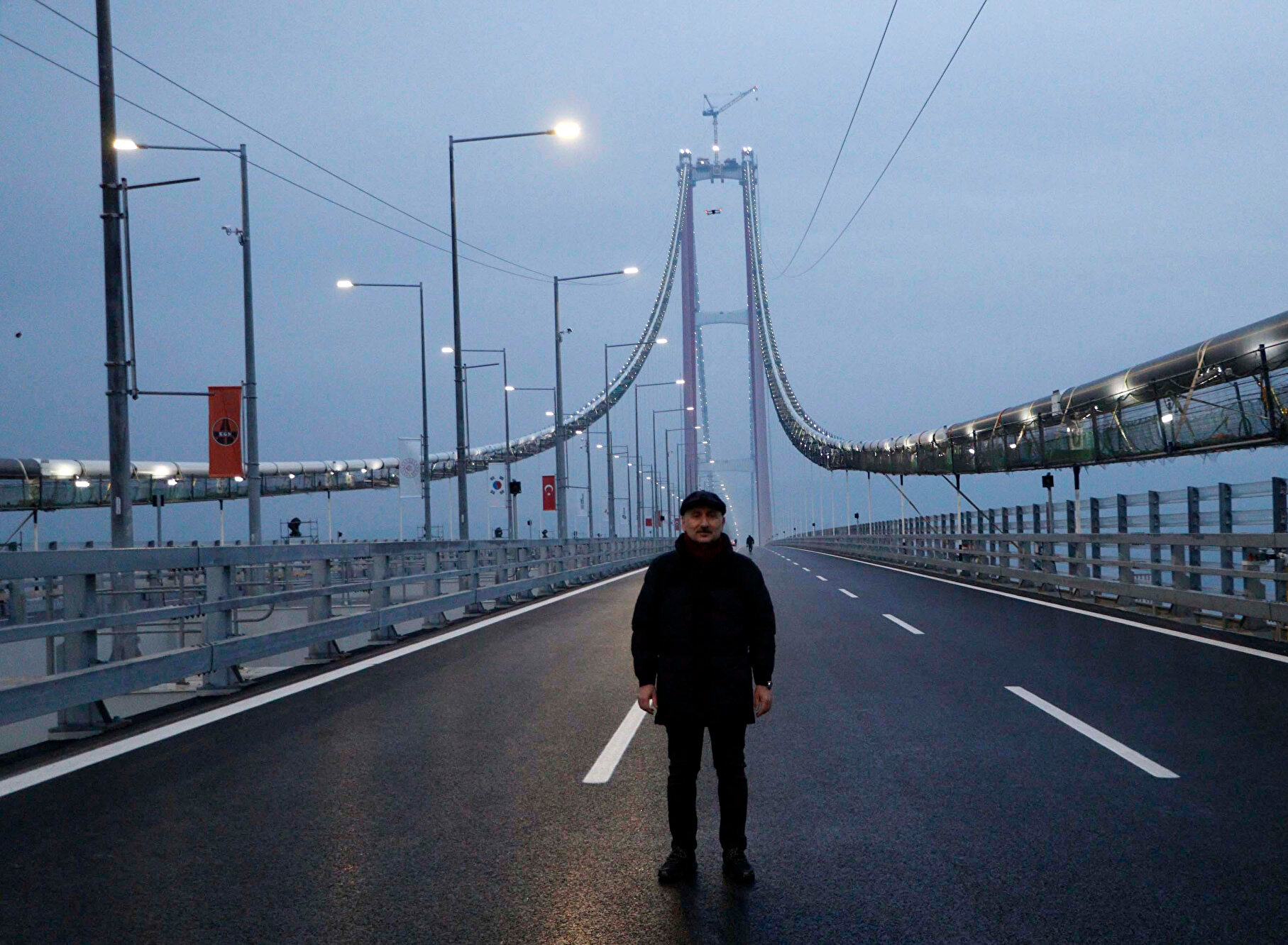 "Bu köprü çok muhteşem bir köprü. Bir abide gibi Çanakkale'de yükseldi. 18 Mart'ta açılması ve şehit kanlarıyla sulanmış Çanakkale'de böyle bir eserin ortaya çıkması, yüz yıllar boyunca bu ülkeye hizmet edecek kıymetli eserin açılışı ve buraya katkıda bulunan tüm arkadaşlarımla, Türkiye Cumhuriyeti vatandaşlarının gurur duyacağı bir projeyi yarın hizmete açıyoruz. Köprümüz sembollerin köprüsü. 18 Mart, 3. ayın 18'i. 318 metre çelik ayak yüksekliği. 2023 metre iki çelik ayak arası açıklığı ile Cumhuriyetimizin 100. yılına ithafen, Seyit Onbaşı'nın 16 metrelik simge top mermileriyle 334 metreye kadar çıkacak çok önemli bir eser. İçinde binlerce matematik formülünü barındıran teknolojik ve mühendislik açısından aslında bir deha ürünü. Böyle kıymetli bir eseri Türkiye Cumhuriyeti'ne ve dünyaya kazandırmanın mutluluğunu yaşıyoruz. O yüzden çok sabırsızlanıyoruz. Şu anda köprünün tam ortasındayız ve gün doğumunu köprünün ortasında karşıladık."