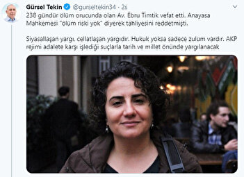 DHKP-C’nin Türkiye sorumlularından Kamile Kayır’la aynı bölmede yakalanan ve cezaevinde eylemde ölen avukat Ebru Timtik'e CHP'li siyasetçi ve gazeteciler sahip çıktı. Sosyal medyadan örgütün avukat yapılanması içerisinde yer alan Ebru Timtik’i savunan CHP İstanbul Milletvekili Gürsel Tekin, gazeteci yazar Yılmaz Özdil ve gazeteci Merdan Yanardağ'ın paylaşımları tepki çekti.