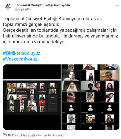 Eşcinseller için yasal düzenleme vaadinde bulunan CHP, ‘Toplumsal Cinsiyet Eşitliği’ adı altında LGBT komisyonu kurdu. Komisyon, gerçekleştirdikleri ilk toplantıyı "Haklarımız ve yaşamlarımız için omuz omuza mücadeleye" sözleriyle duyurdu.