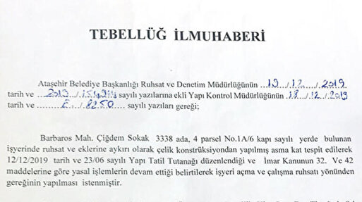 - Yaşanan olayın ardından söz konusukuaföre iki ayrı tebligatgönderildi. 17 Aralık günü Ataşehir Belediyesi’nden gönderilen tebligatta, kuafördeki asma katın usule aykırı ve kaçak olduğu belirtilerek bir ay içinde ruhsat alınması, aksi halde yıkılması gerektiği yazıyordu.20 Aralık’ta gönderilen ikinci tebligatta ise asma katın 15 gün içinde yıkılması gerektiği bildirildi.