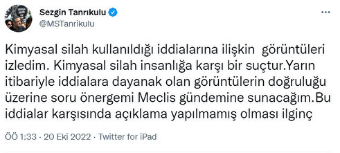 - CHP İstanbul Milletvekili Sezgin Tanrıkulu ise sosyal medya hesabından yaptığı açıklamada Şebnem Korur Fincancı'ya destek vermişti. Tanrıkulu yaptığı paylaşımda “Kimyasal silah kullanıldığı iddialarına ilişkin görüntüleri izledim. Kimyasal silah insanlığa karşı bir suçtur. Yarın itibariyle iddialara dayanak olan görüntülerin doğruluğu üzerine soru önergemi Meclis gündemine sunacağım. Bu iddialar karşısında açıklama yapılmamış olması ilginç” ifadelerini kullanmıştı.