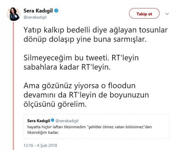 Ancak gece yarısı boyunca bilgisayarın başından ayrılmayan Sera Kadıgil, hakaret içeren tüm tweet'lerini tek tek sildi.