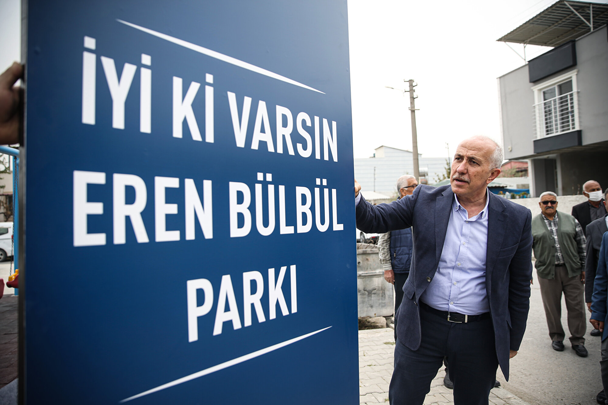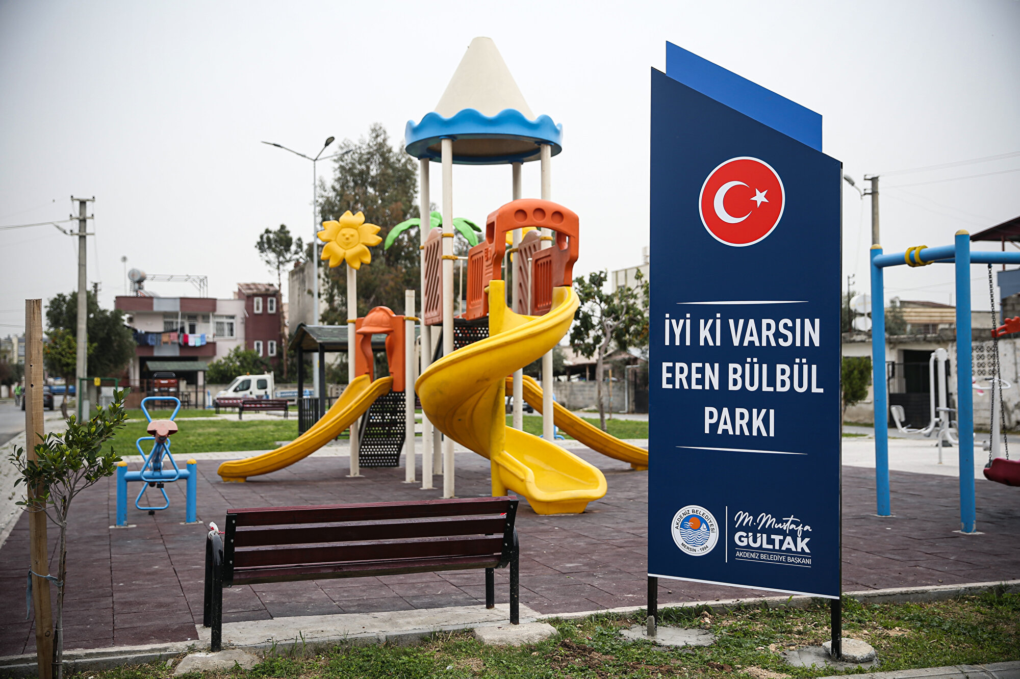 Akdeniz Belediye Başkanı Mustafa Gültak, mahalleli ile birlikte ’İyi ki varsın Eren Bülbül Parkı’ yazılı tabelayı parka dikti.