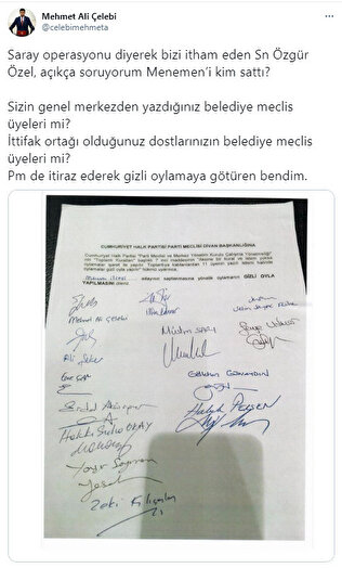 İzmir milletvekili Mehmet Ali Çelebi, yaptığı son dakika açıklamasında Özgür Özel'e sert ifadelerle yüklendi. CHP'li Menemen Belediyesi'nde ortaya çıkan yolsuzluğun ardından yapılan 'Başkan Vekilliği' seçiminde Millet İttifakı'nın verdiği fireyi hatırlatan Çelebi, sosyal medya üzerinden "Saray operasyonu diyerek bizi itham eden Sn Özgür Özel, açıkça soruyorum Menemen'i kim sattı? Sizin genel merkezden yazdığınız belediye meclis üyeleri mi? İttifak ortağı olduğunuz dostlarınızın belediye meclis üyeleri mi? Pm de itiraz ederek gizli oylamaya götüren bendim." dedi.