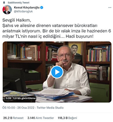 CHP Genel Başkanı Kemal Kılıçdaroğlu, akşam 5:32’de Twitter hesabından “Sevgili halkım, bu akşam saat 22:00'da önemli bir konu hakkında size bilgi vereceğim. Burada buluşmak üzere” notuyla bir paylaşım yaptı.